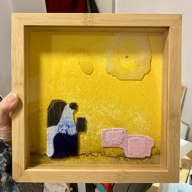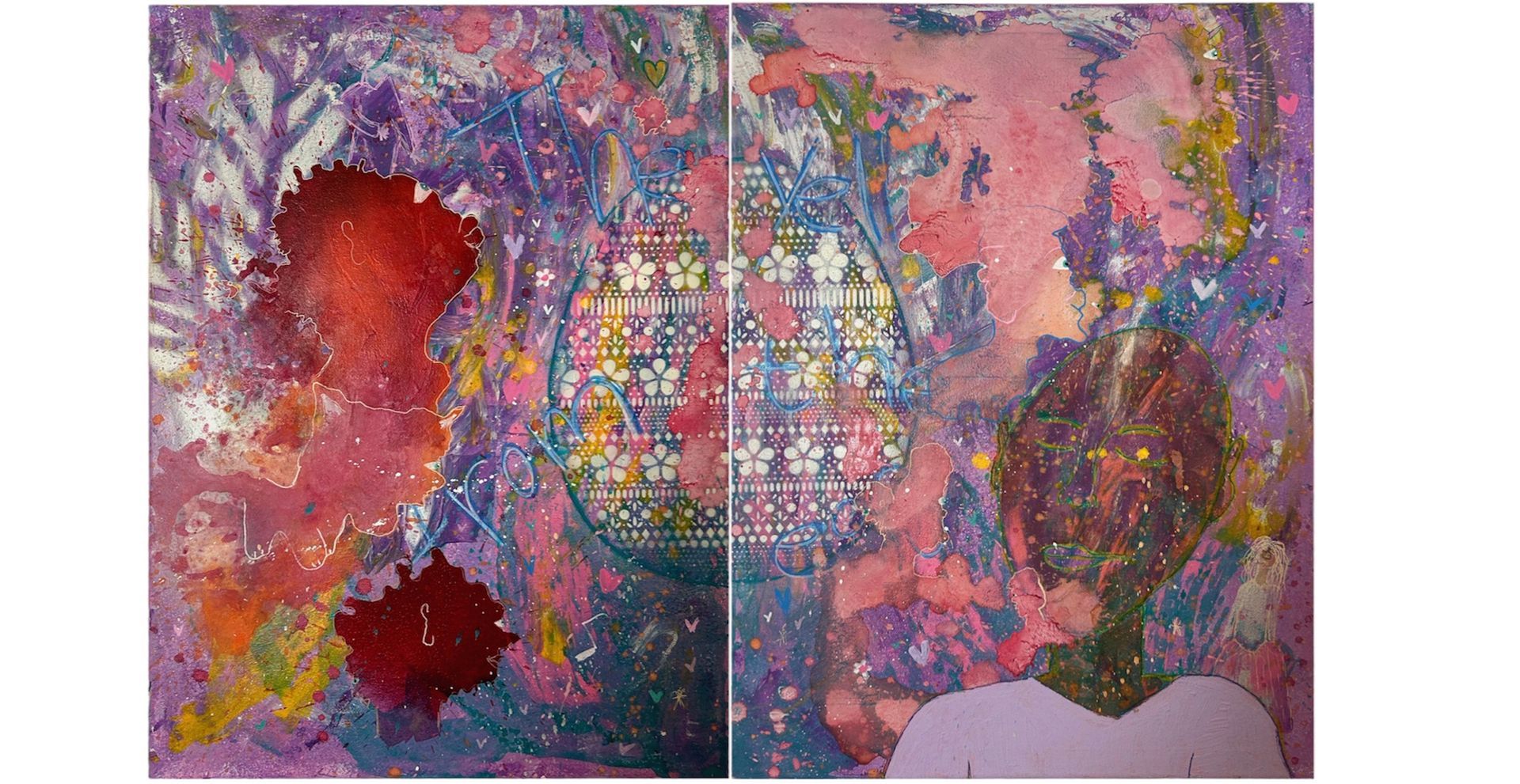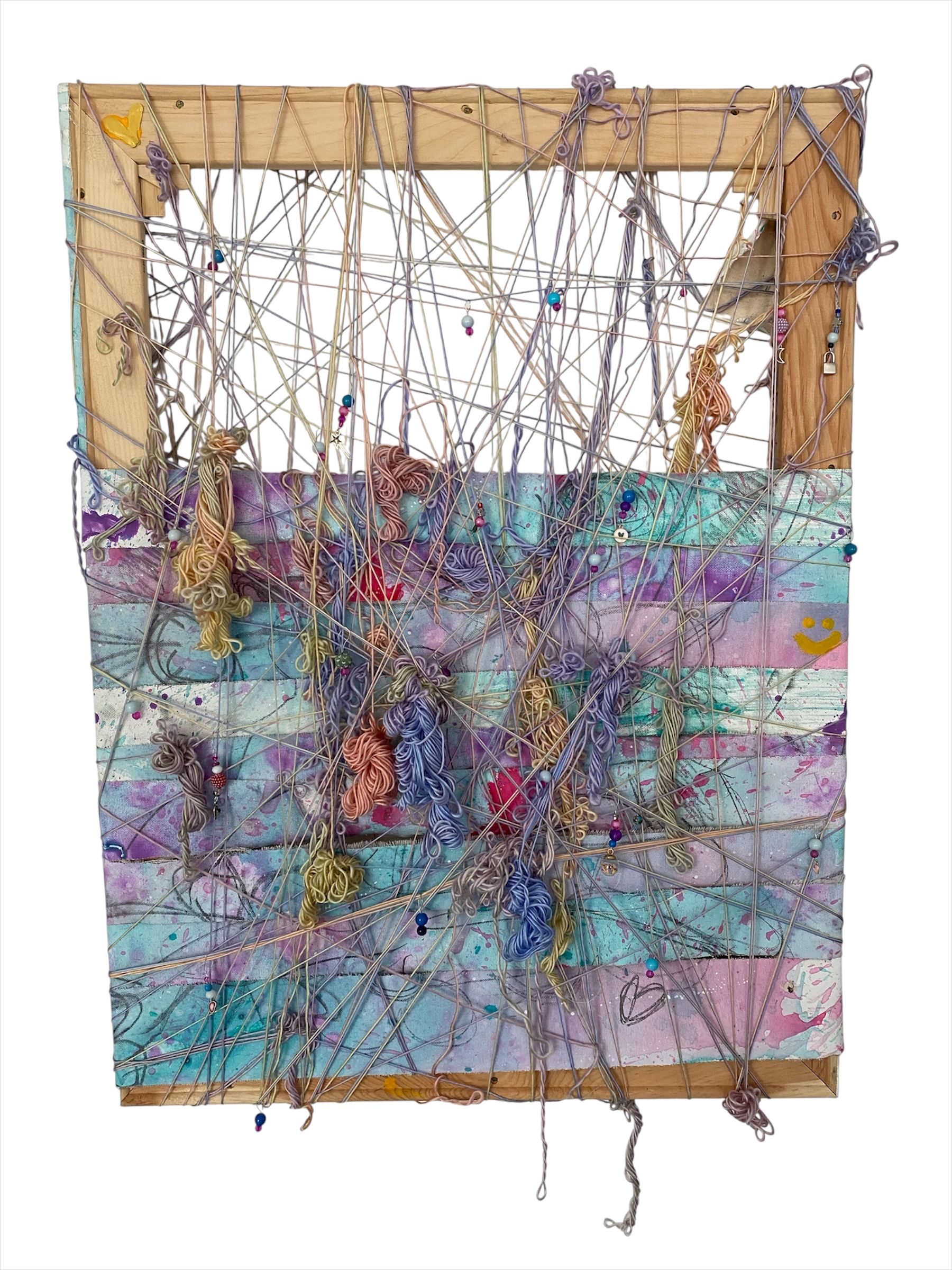 Mixed-media, Leinwand, Acryl, Bleistift, Garn, Perlen