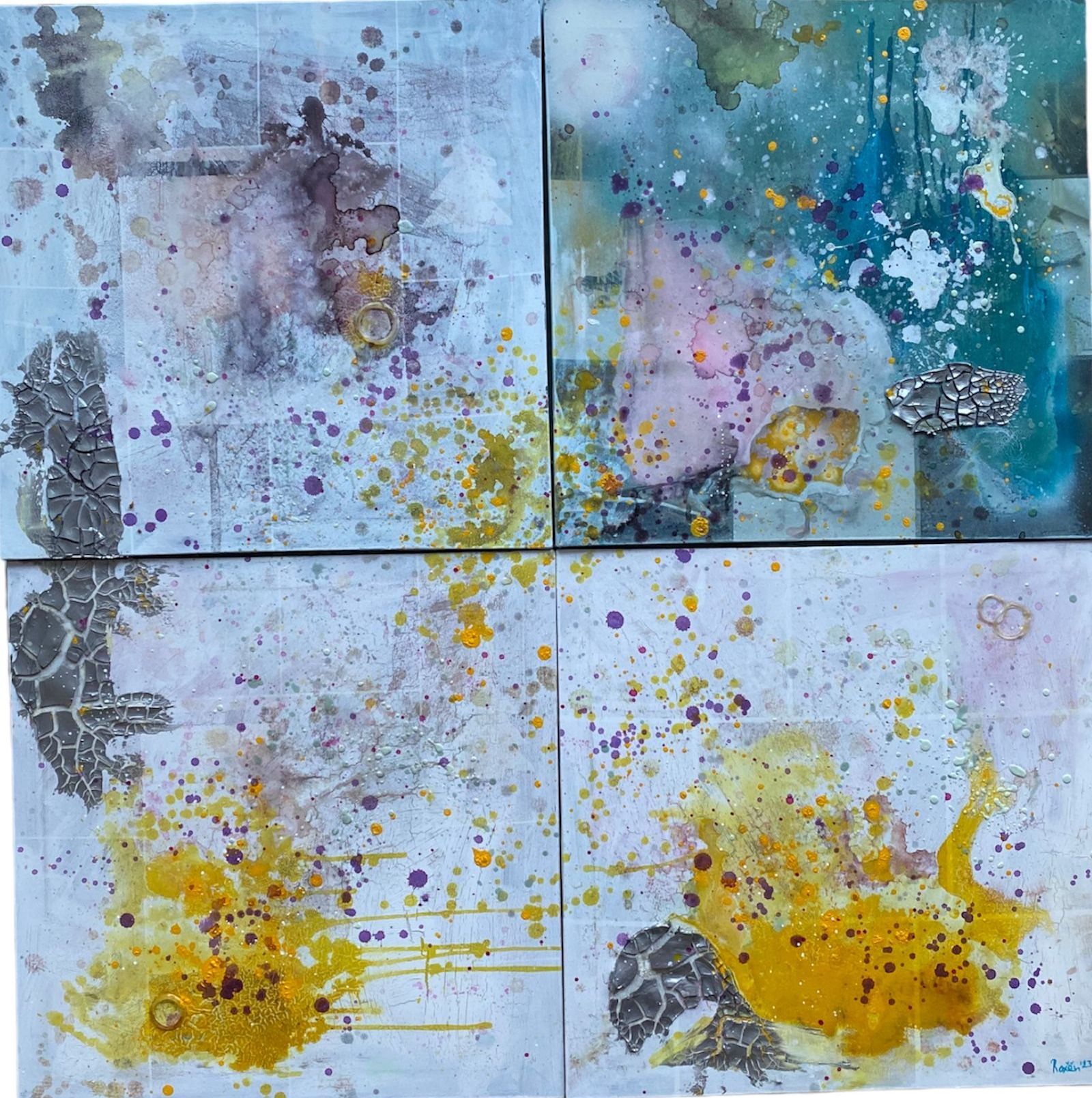 Mixed-Media, Strukturen, Kaffee, Acrylfarben, Tuschen und Resin auf Holzmalgrund