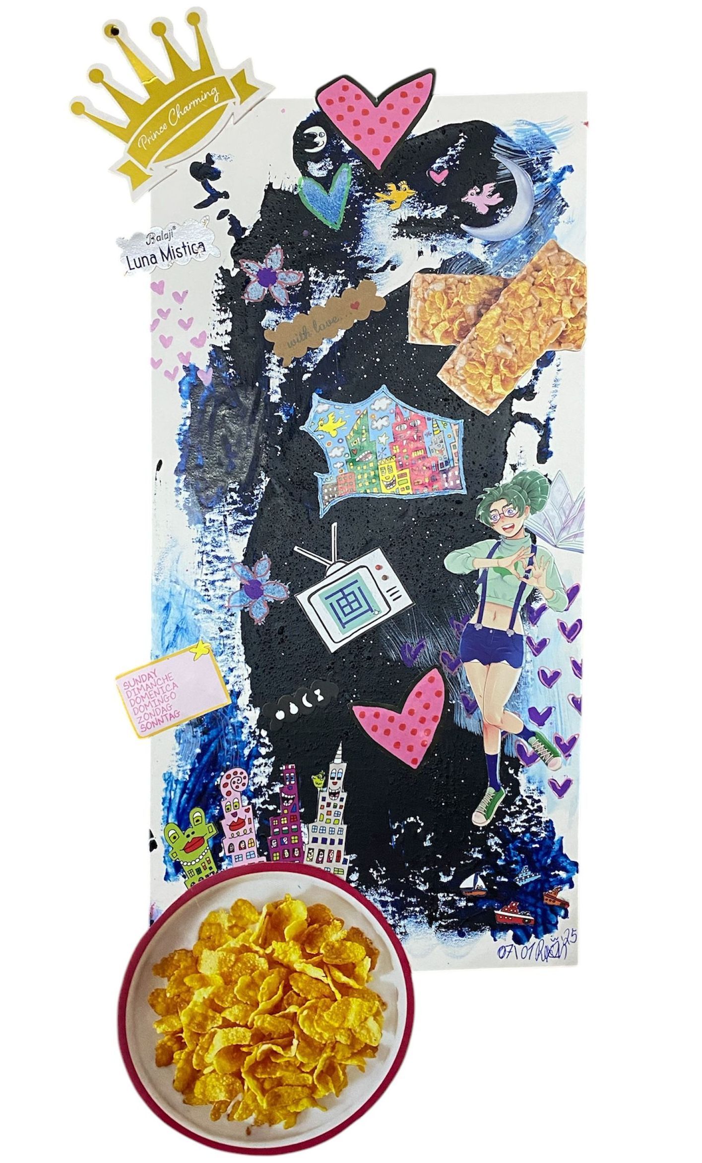 Mixed-media, Aquarelle, Collagen, Stifte, Holz, Perlen